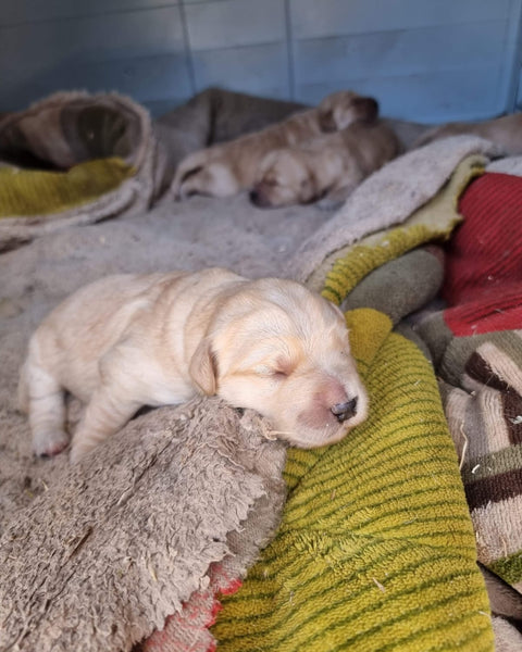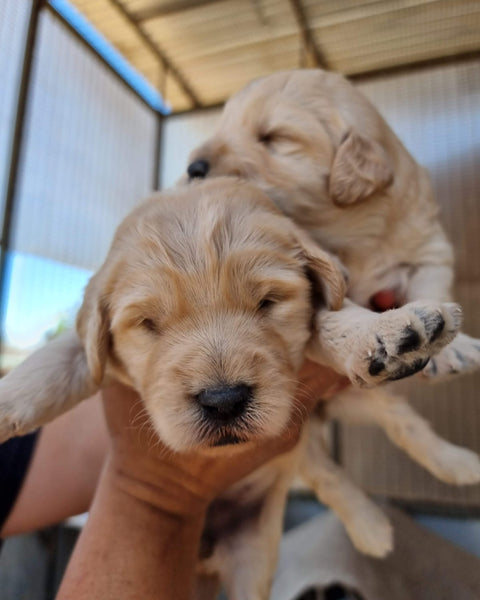 Nuestros primeros cachorros, nacieron de una madre Golden Retriever color miel, y el Padre un Poodle estándar blanco. Ambos padres, los tenemos en casa, e inscritos. Nuestros cachorros son de primera generacion hasta ahora, y se les llama F1.